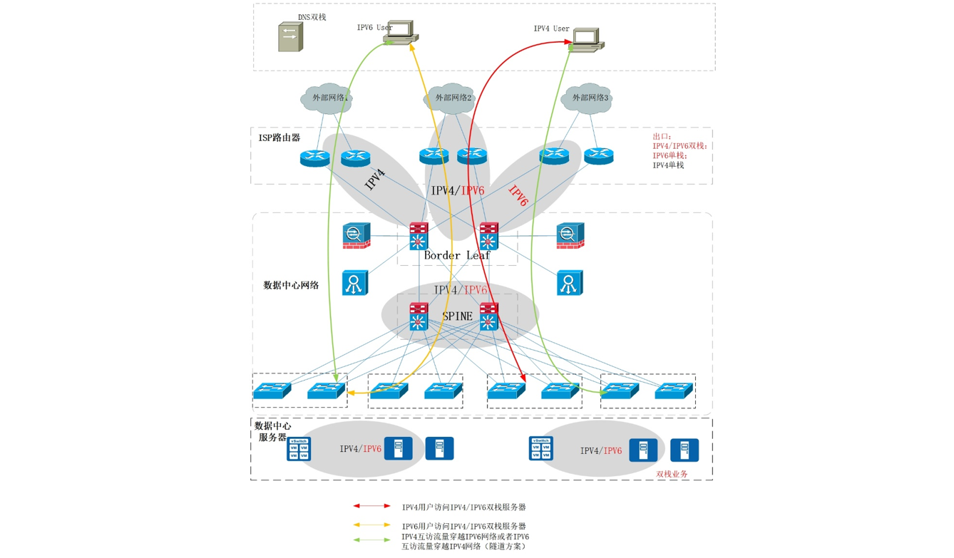 ●数据中心内的业务系统全部为IPv4/IPv6双栈,可以不依赖NAT64直接对给予双栈服务